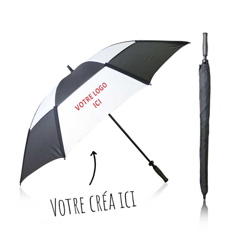 Parapluie de Golf de 8 panneaux au design sobre bicolore et de 135cm de diamètre, à ouverture manuelle. Fabriqué en matériau robuste pongée, avec système de sécurité anti-vent. Tiges et axe en fibre noir, avec double fermeture velcro et poignée douce assortie.
