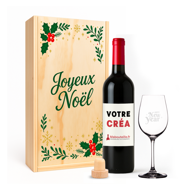 Offrez un cadeau d’exception avec Le coffret Joyeux Noël personnalisé : une élégante caisse en bois naturel contenant une bouteille de Bordeaux Rouge et un verre à vin 36cl personnalisés par gravure laser. Un coffret raffiné, parfait pour les amateurs de vin et les grandes occasions : anniversaire, fête des pères, mariage ou remerciement client. Un présent unique, à la fois authentique et personnalisé, qui sublime l’art de vivre à la française.