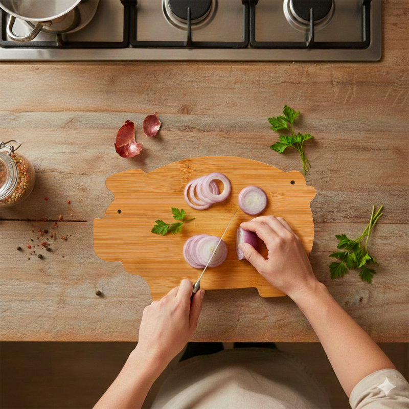 Planche de cuisine au design original en forme de cochon, fabriquée en bambou doux.