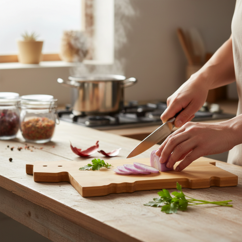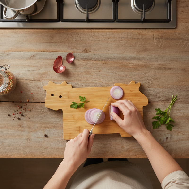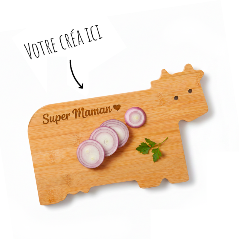 Planche de cuisine au design original en forme de vache, fabriquée en bambou doux.