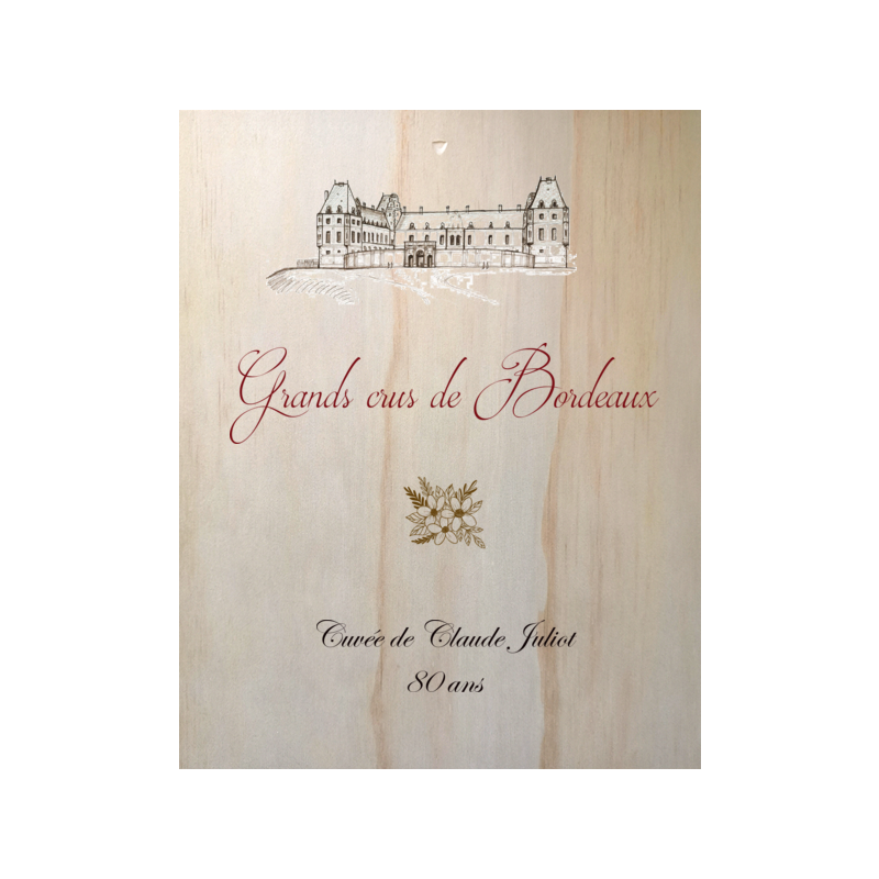 Détail du coffret : le coffret comprend 3 bouteilles avec l'étiquette d'origine du Château + 1 caisse bois personnalisable