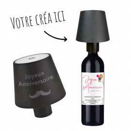 Sublimez vos bouteilles avec cette lampe de table. Une lampe sans fil pour bouteille de vin, compatible avec tout type de bouteille ayant un diamètre de 3 cm maximum. Rechargeable en USB, autonomie de 15 heures. La personnalisation se fait par gravure laser (effet brûlé et légèrement creusé). Possibilité de graver du texte, un logo (simple) mais pas de...